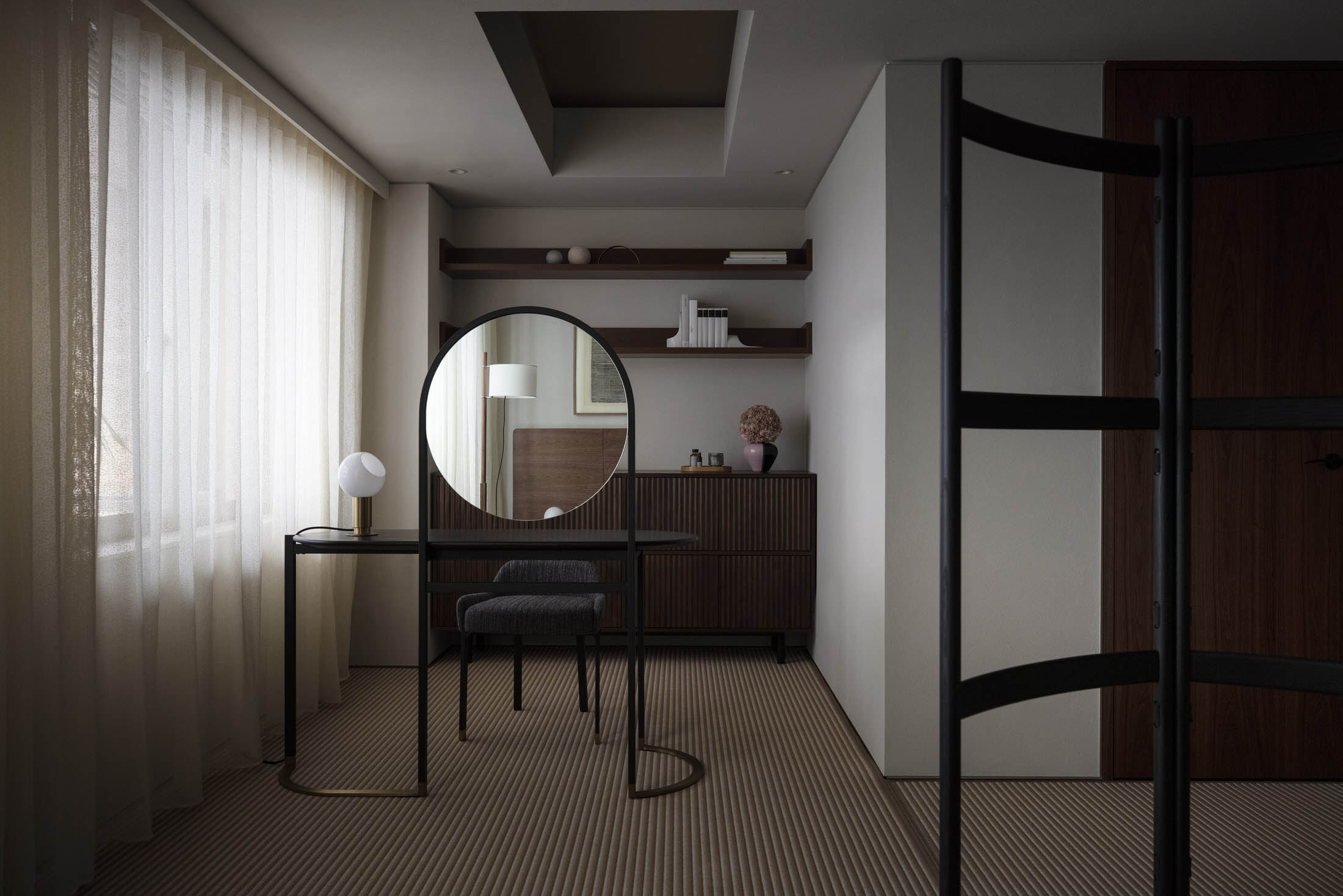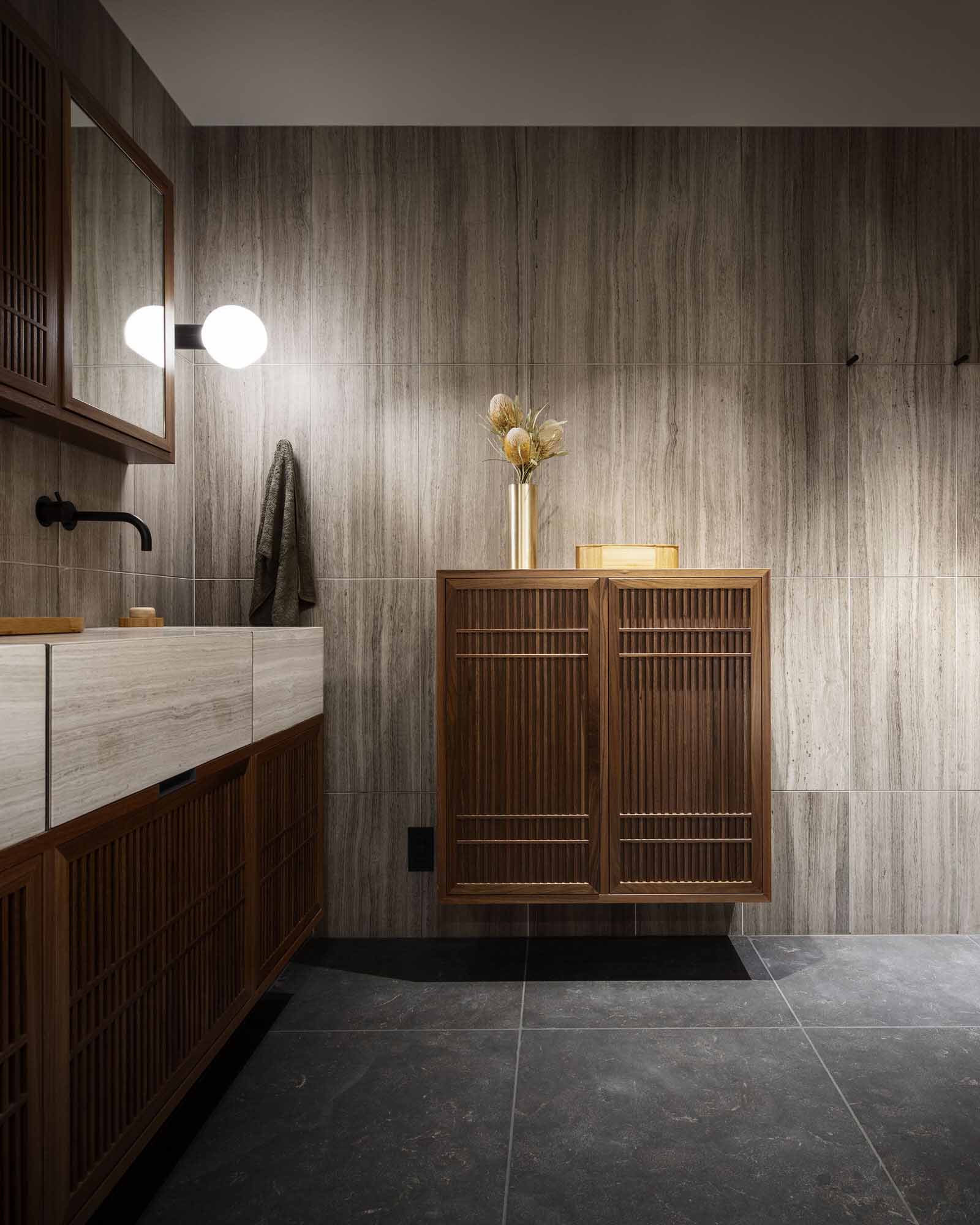 在设计中,地毯类似于日本的纺织图案。走廊直接通向客厅,从地毯到镶嵌石头的自然过渡,当穿过精致的百叶窗墙时,石头又通向相邻房间的木地板,百叶窗可以打开或关闭。