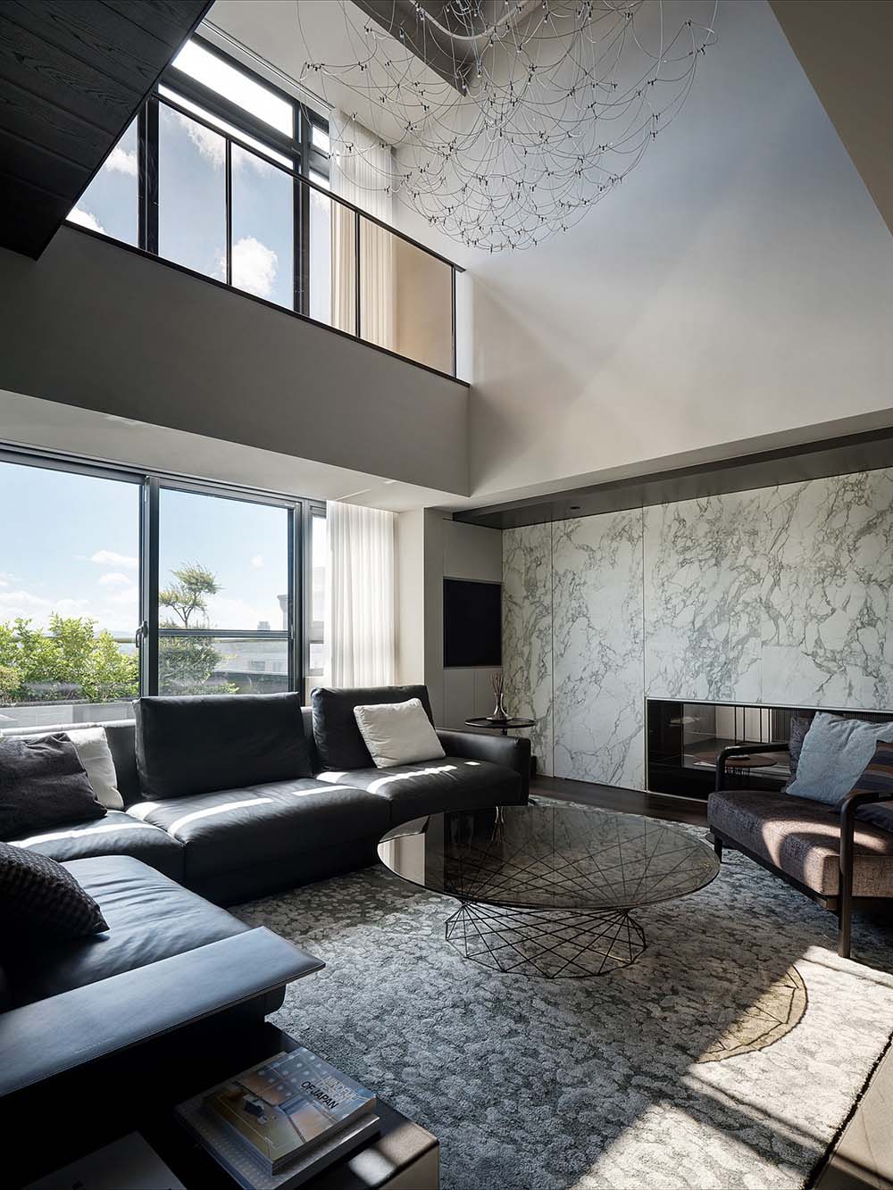 设计师企图于屋内每一道墙,推敲与自然结合的可能性,最终行笔之处落在使墙面退缩,打造一处绿意盎然的半户外阳台植栽区,让人与植物一起进行光合作用。如此巧思,不仅将视觉向外延伸、模糊了室内与室外的界定,同时透过水平与垂直交织的空间区划,使格局及动线的安排呈现秾纤合度的美感。