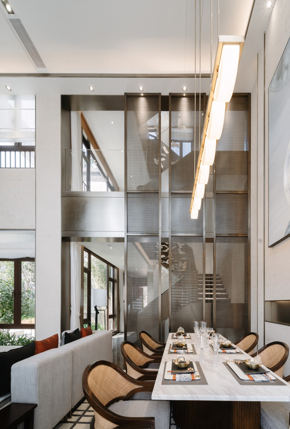 同时,餐厅的吊灯组合拉伸了空间的纵深感,墙壁上浅蓝色的艺术挂画仿佛让人由建筑的小空间走入自然的大空间,意境深远,可见一斑。