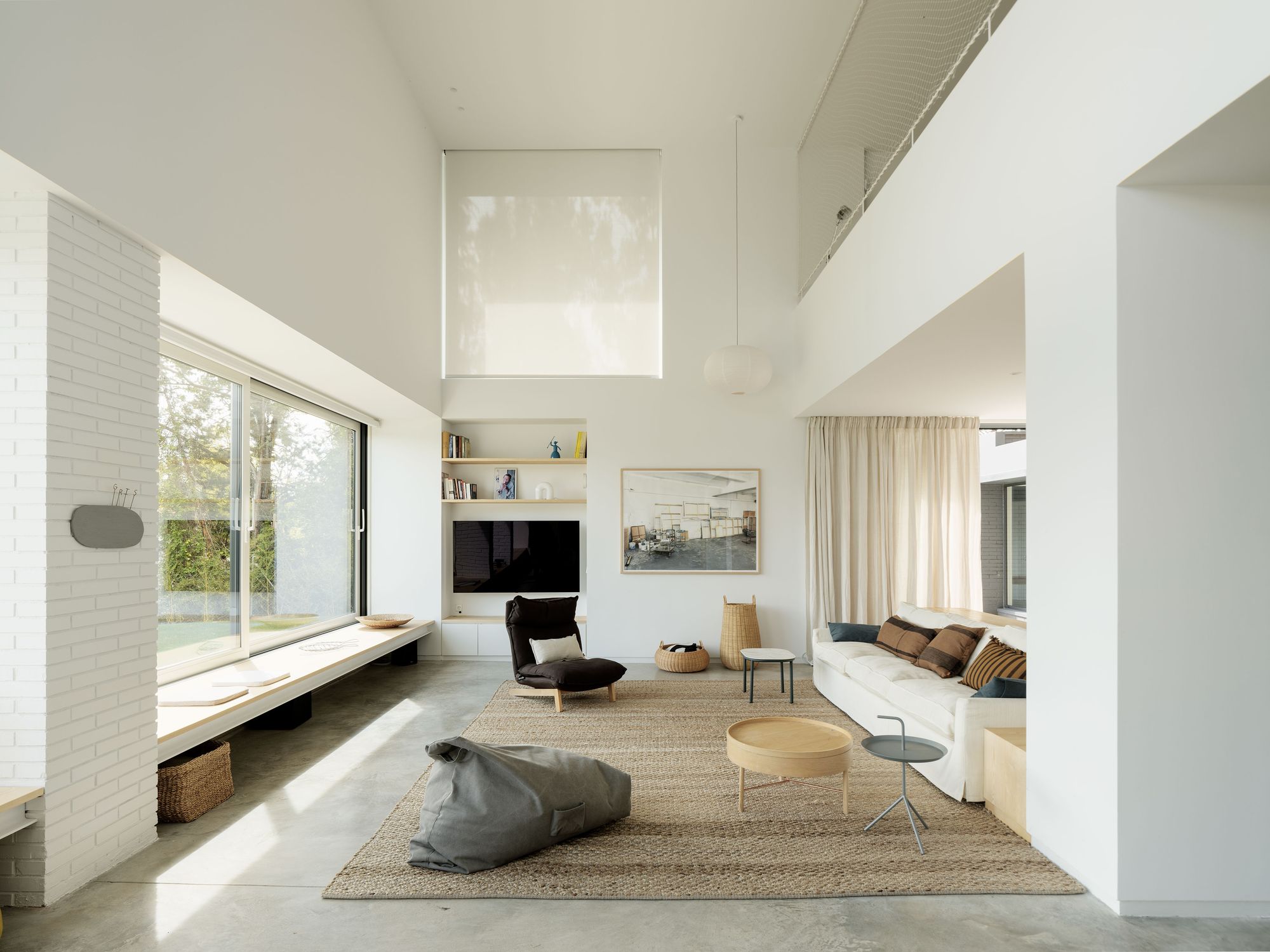 这是一间白色极简风格别墅设计,原来的房子是用红砖和鲑鱼色砂浆建造的,带有四坡屋顶,包括一个双高斜门廊和两座附属建筑。