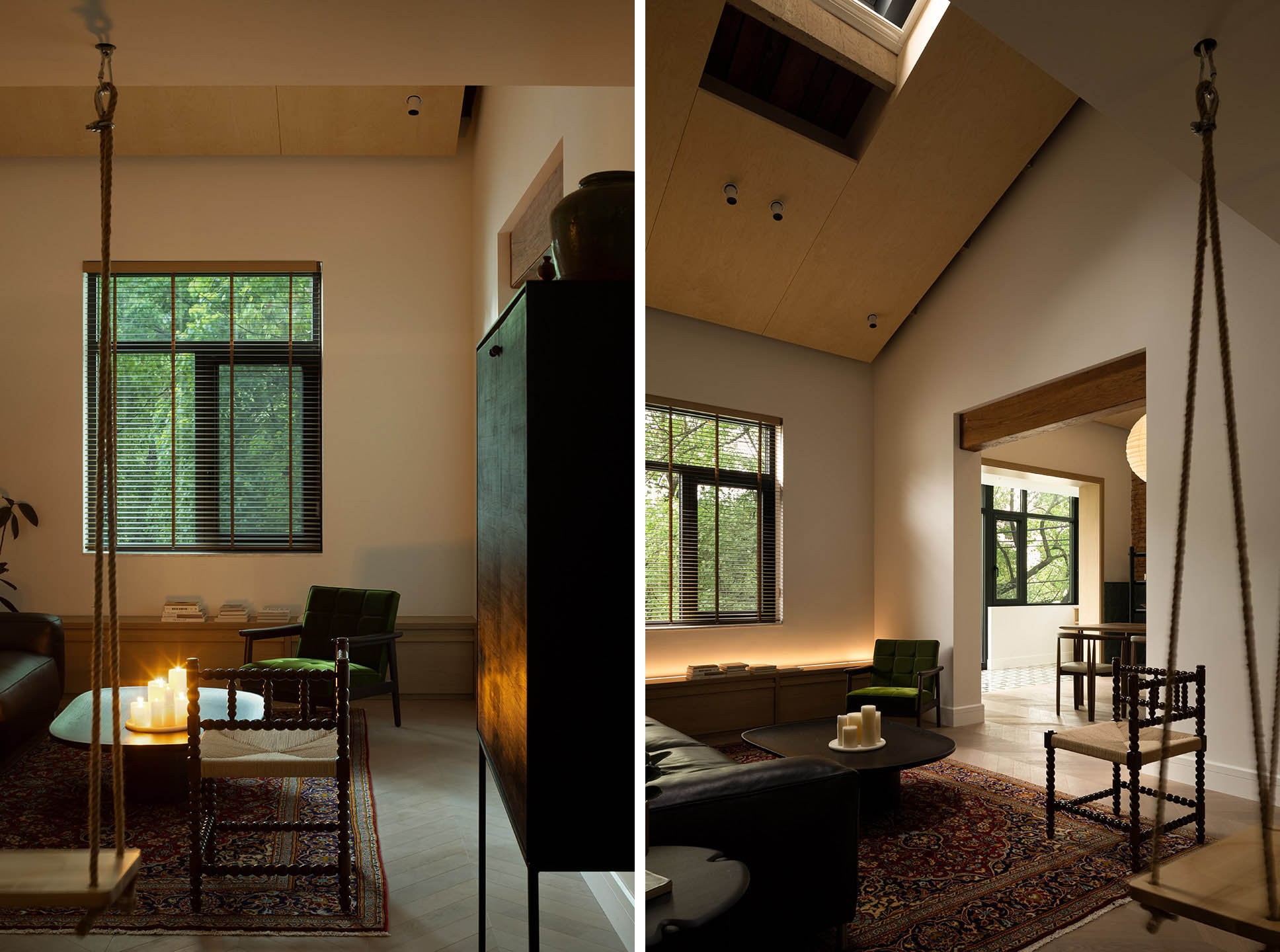 有一个理想的房子才是家理想的样子。一颗老树伫立于窗前,不知陪伴了这所房子多少年,无疑,二者有着最亲密的关系。在屋内,设计于朝南面空间设置极佳的视野,站在窗前能将外部风景收入眼底——望向被树荫遮挡的白云,飞过空中的鸟儿,楼下悠闲散步的邻居,百年韵味的建筑轮廓,远处嘻嘻闹闹的街道……将城市变化引入生活空间,种种景色,都等于这间住宅私有,自然给了他们更多的“财富”。