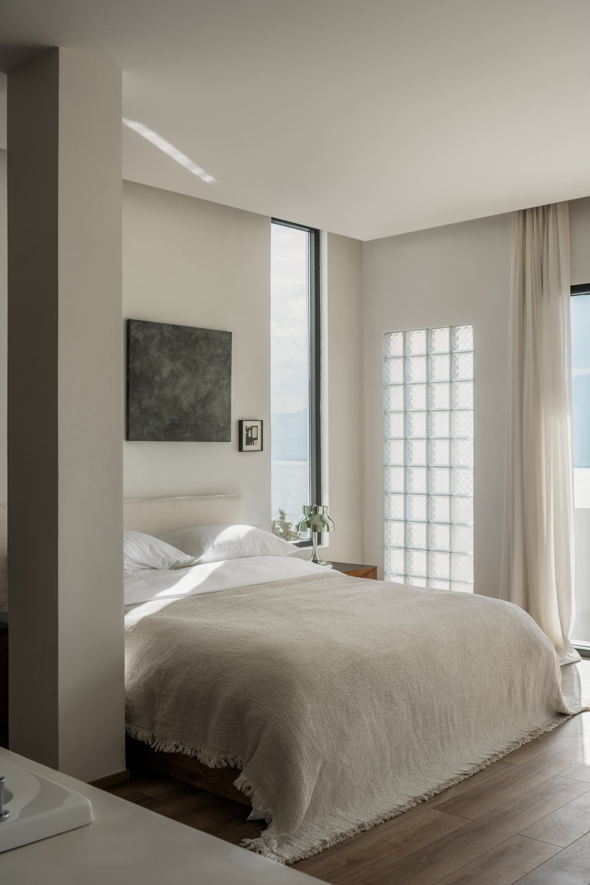景观露台-景观浴缸-卧室-卫生间的布局很深,巧妙地将自然风光“引入”室内空间。关于窗户,设计师放弃了大理大理大窗户的正常做法,而是使用垂直长窗户。这样,窗户曝光的规模是有限的,阻挡了多余的视线,但赋予了窗外的风景更多的力量。设计师追求的是原有和质朴纯粹美的整体建筑美学,避免了复杂的色彩和多余的元素。从外部到内部的过渡自然而平稳,符合简单,宁静和发人深省的整体基调。