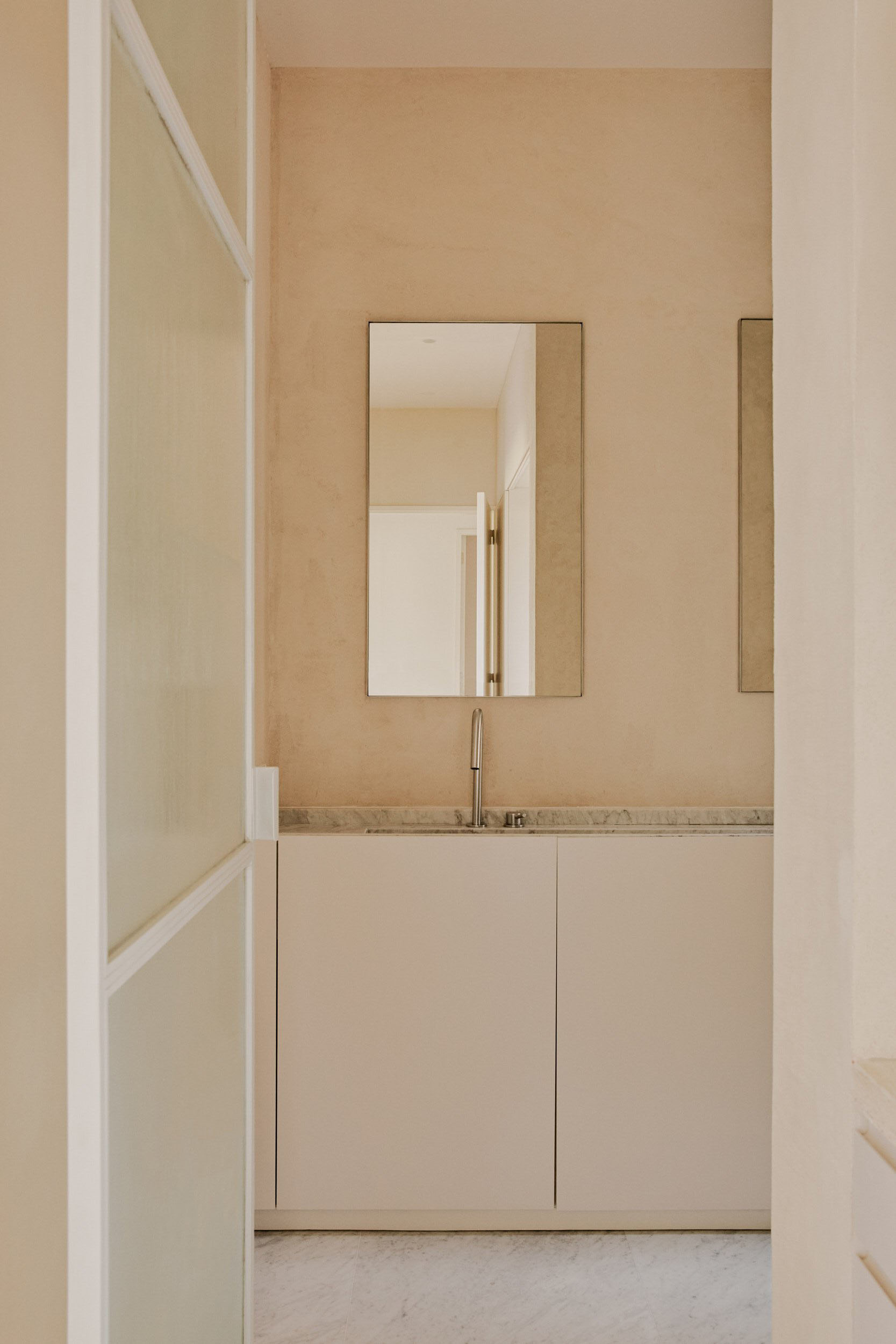 墙壁涂有使用充气石灰基底的天然砂浆,根据光线改变颜色,在最明亮的房间里涂上米白色油漆。地板是用木头铺设,在浴室等某些区域,地板是用石材建造。当用户从一端走到另一端时,材料、光线和颜色的这些组合会发生变化,在穿过 Serial Vision Home 的墙壁层时形成不同的体验。