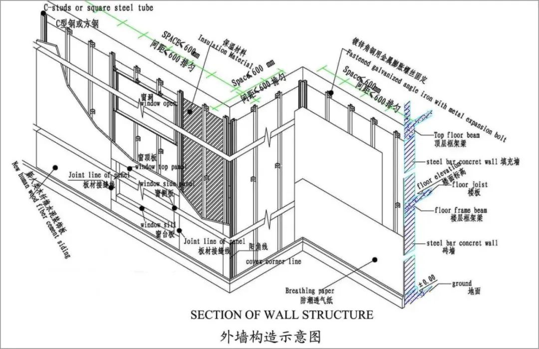 1、墙体可分为单层轻钢龙骨双面固定纤维水泥板和双层轻钢龙骨双面纤维水泥板错缝固定在龙骨上,中间填充岩棉或其它保温材料,这主要取决于隔户墙还是隔室墙,也就是取决于建筑隔声设计要求。纤维水泥板的厚度应取8-10mm(内墙)、12mm(外墙)板,光面向外。国外大都采用压条法或明缝施工。